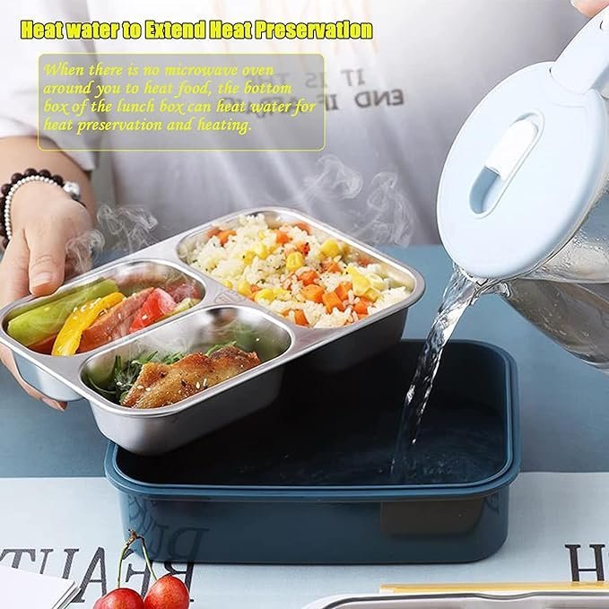 Leakproof Bento Box, Detachable Stainless Steel Tray for Warm Water Insulation 3 Containers Lunch Box (750 ml)